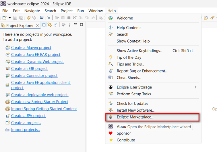 Bước 1: Mở Eclipse -> vào menu Help -> Eclipse Marketplace…