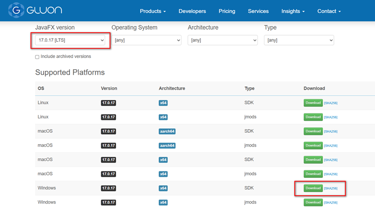 Bước 2: Tải JavaFX 17 tại link sau: https://gluonhq.com/products/javafx