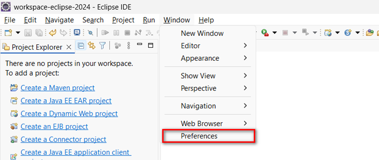Bước 4: Mở Eclipse vào Menu Windows-> Preference