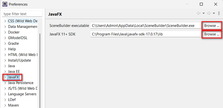 Kích vào Browser tìm đường dẫn cài SceneBuilder và chọn, tìm đường dẫn JavaFx và chọn (tương tự hình trên) -> Chọn apply and close để kết thúc.