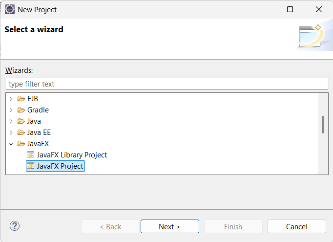 Bước 5: Tạo mới 1 project trong Eclipse và kiểm tra nếu thấy xuất hiện JavaFX Project như hình dưới là thành công.